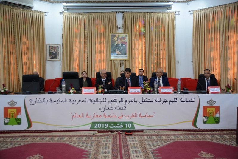 في غمرة احتفالات الشعب المغربي بذكرى عيد العرش المجيد وذكرى ثورة الملك و الشعب وعيد الشباب، و بمناسبة الاحتفال باليوم الوطني للمغاربة المقيمين بالخارج و الذي يخلد هذه السنة تحت شعار » سياسة القرب في خدمة مغاربة العالم »، احتضن مقر عمالة إقليم جرادة صباح يومه السبت 10 غشت 2019، لقاء تواصليا مع أفراد الجالية المغربية المقيمة بالخارج التابعين للإقليم، ترأسه السيد عامل إقليم جرادةبحضور السادة: رئيس مجلس إقليم جرادة، رئيس غرفة الصناعة التقليدية بجهة الشرق، رجال السلطة،رؤساء الجماعات الترابية، رؤساء وممثلو المصالح الأمنية و الخارجية، رؤساء وممثلو المؤسسات البنكية، فعاليات المجتمع المدني وممثلو وسائل الاعلام.