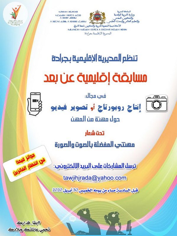 في سياق مواصلة تفعيل خطة الاستمرارية البيداغوجية، وفي إطار تقديم خدمات التوجيه المدرسي والمهني والجامعي عن بعد، تنظم المديرية الإقليمية بجرادة مسابقة إقليمية إبداعية عن بعد في مجال إنتاج ربورتاج أو تصوير فيديو حول مهنة من المهن تحت شعار « مهنتي المفضلة بالصوت والصورة »، خاصة بتلاميذ إقليم جرادة بمختلف مستوياتهم الدراسية.