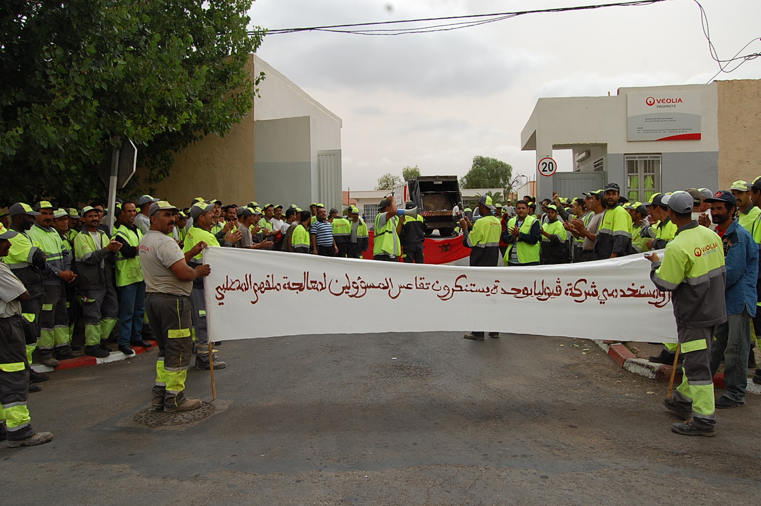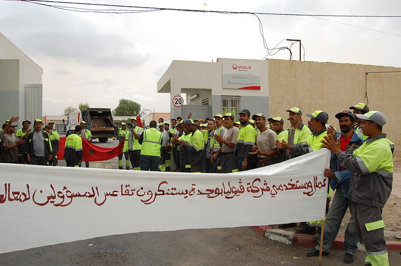 « يا حكومة يا وزير// 5 في المائة واش ادَّيرْ؟ » و » النظافة ها هي// والحقوق فينا هي؟ » و|هذه عار هذا عار //العمال في خطر » و »في تمارة بغيتونا/في المنحة كليتونا » و »في تمارة بغيتونا/ في حقوقنا كليتونا » و »هز مدير حط مدير// لا إصلاح لا تغيير » تلكم بعض الشعارات التي رددها ما يزيد على 150 من أعوان النظافة يمثلون حوالي 472 من أعوان الأشغال الشاقة والملوثة من عمال شركة النظافة « فيوليا » في الوقفة الاحتجاجية التي نظموها أمام مقر الشركة الفرنسية بمدينة وجدة صباح يوم الاثنين 8 شتنبر الحالي. وتأتي هذه الوقفة الاحتجاجية حسب تصريح العمال بعد أن تأكدوا جليا من الإجهاز على حقوقهم ومكتسباتهم ومن تنصل مسؤولي الشركة من التزاماتهم السابقة وعدم جديتها في تدبير ملفات وشؤون عمالها الذين يعتبرون من أعوان الأشغال الشاقة والملوثة.