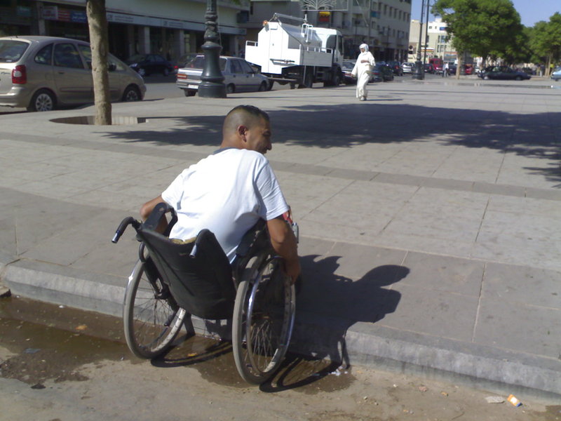 كان يحاول وحده صعود الرصيف بكرسيه المتحرك في تحدٍّ لإعاقته دون أن يطلب مساعدة أحد، وكان عليه قبول هذا التحدي في استقلالية تامة عن الآخرين. كان « سعيد » في الثلاثين من عمره قوي البنية صحيح الجسم مفتول العضلات حيث يبدو أنه من الرياضيين المعاقين على كرسيه المتحرك واختار بالطبع المعبر الذي يطلق عليه « الولوجيات » بأحد أرصفة شارع محمد الخامس المؤدي إلى ساحة 16 غشت، وهو المَعْبر المُخصَّص للمعاقين أصحاب الكراسي المتحركة في إطار القانون الجديد التي تفرض تخصيص هذه الولوجيات وهي ممرات مفتوحة لتسهيل تنقلات المعاقين بالنسبة للطرقات يكون مستوى رصيفها بمستوى الطرقات… كان يحاول « سعيد » في مغامرة بعد التحدي تجاوز الممر عبر حاجز الرصيف الذي تم تخصيصه كجميع الممرات بشوارع مدينة وجدة التي تمت إعادة إصلاحها في إطار مشروع ضخم لإعادة هيكلة المدينة الألفية بمئات الملاين من الدراهم لكن…لكن ارتأى مهندسو الطرقات والمقاولة التي تكلفت ظفرت بصفقة بنائها أن يرفعوا من مستوى رصيف الولوجيات بأكثر من 15 سنتيمترا (؟) على مستوى الطريق…