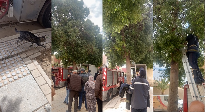 عملية تدخل ناجحة لرجال الوقاية المدنية لإنقاذ قط عالق في شجرة كثيفة الأغصان بوجدة