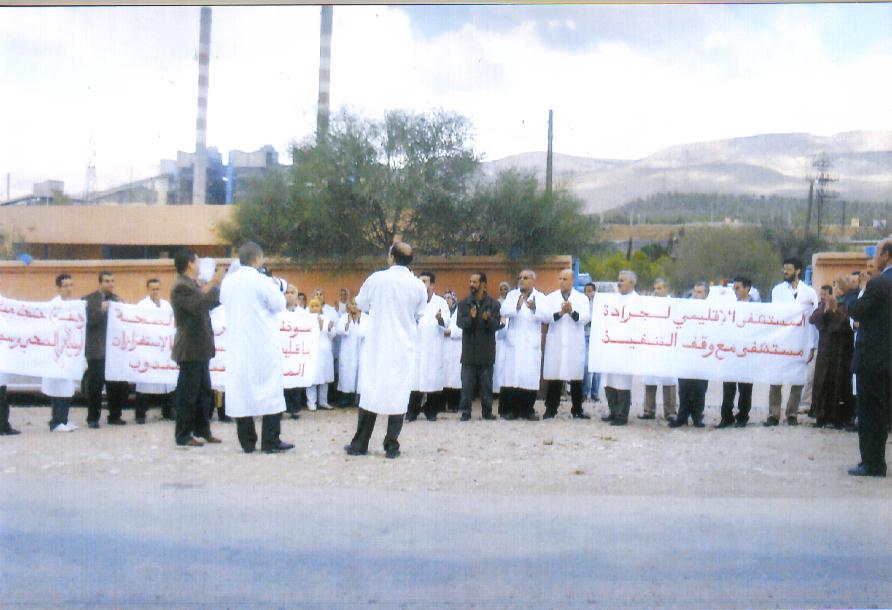 « شوف رواح تشوف المشاكل بالألوف// المندوبية نائمة والمشاكل قائمة » و » يا مندوب يا مسؤول هاذ الشي ماشي معقول » و »هذا عيب هذا عار الصحة في خطر » تلكم بعض الشعارات الاستنكارية والتنديدية بوضعية المستشفى الإقليمي لمدينة جرادة الذي لم يمرًّ على تدشينه من طرف صاحب الجلالة ثلاثة أشهر فقط، شعارات رددتها حناجر حوالي 76 طبيبة وطبيبا ( 17 طبيبا منهم 4 أخصائيين) وممرضة وممرضا وتقنيين وسائقي سيارات الإسعاف في الوقفة الاحتجاجية التي تم تنفيذها صباح يوم الخميس 9 أكتوبر الجاري من الساعة العاشرة إلى حدود الساعة الحادية عشرة أمام مقر المندوبية الإقليمية لوزارة الصحة بجرادة وموازاة معها تم تنفيذ وقفة احتجاجية بالمركز الصحي بعين بني مطهر. وقد حمَّل هؤلاء المحتجين مسؤولية ما آلت إليه أوضاع المستشفى والصحة بإقليم جرادة إلى المندوب الإقليمي بسبب عدم كفاءته في التسيير الإداري واستفراده بالقرارات دون استشارة المعنيين بالأمر أو النقابات الممثلة للقطاع الصحي إضافة إلى انعدام التواصل البناء والحوار الجادّ في البحث عن حلول للمشاكل العديدة والمتنوعة للقطاع بالإقليم. وضعية استنكرها بلاغ النقابات الصحية الأربعة الداعية إلى الوقفة الاحتجاجية الانذارية (كدش وفدش والنقابة المستقلة والمنظمة الوطنية الديمقراطية) ومما جاء فيه، » ومن أهم الاختلالات التي يعاني منها القطاع الصحي والمستشفى الإقليمي لمدينة جرادة نذكر على سبيل المثال لا الحصر: التجاوزات المتكررة للسيد المندوب وانفراده بإصدار القرارات على هواه دون استشارة اللجان المعنية فلا صوت بعلو فوق صوته ولعل إعفاءه لمدير المستشفى من مهامه وتنصيب نفسه بدلا عنه وتعيين طبيب رئيسي لقيم المستعجلات والتفويت الزبوني للسكن الوظيفي أمثلة حية على سوء التسيير وضرب لمبدأ الحكامة الجيدة وتخليق القطاع ». من جهته نفي الدكتور حسن بنسار المندوب الجهوي لوزارة الصحة بجرادة كل التهم الموجهة إليه مؤكدا في تصريحه للأحداث المغربية على تواصله مع الأطباء والممرضين وعمله على الاستجابة لمتطلبات المستشفى والقطاع بالإقليم بكل ما يملك مشيرا إلى أنه راسل الوزارة في ما يخص حل بعض المشاكل التي تدخل في اختصاصاته مع العلم أن هناك مشاكل تتجاوز اختصاصات المندوبية كمشكل الماء الذي تمت مناقشته مع الوكالة المستقلة لتوزيع الماء ومشكل النقل « لقد توصلنا بحلول لجميع النقط بعد أن عالجناها مع المدير الجهوي وجاءت الوقفة الاحتجاجية مباغتة…هؤلاء ليسوا متفقين مع إستراتيجية الوزارة التي أتبعها إضافة إلى بعض الإجراءات الجديدة التي تقوم بها الوزارة خلال سنة 2008 كنظام المداومة والاحتفاظ بالمرأة النفساء ل48 ساعة « . كما أشار إلى أن أغلب الأطباء لا يتواجدون باستمرار في المراكز الصحية وهو ما يرفضه لأنهم يخضعون لقانون الوظيفة العمومية.