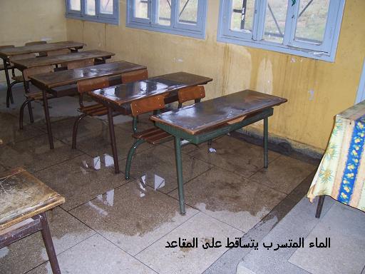 حولت الأمطار التي سقطت بكثافة سقوف الحجرات الدراسية إلى غرابيل تخترقها المياه المتسربة ، وتحولت قاعات الدرس إلى برك مائية يستحيل العمل داخلها . ومما زاد من تفاقم الوضع اختناق قنوات صرف الماء التي عجزت عن تصريف الكم الهائل من المطر المتساقط ، فلم يعد تسرب المياه مقتصرا على الحجرات العلوية بل تضررت كذلك بعض الحجرات السفلية .