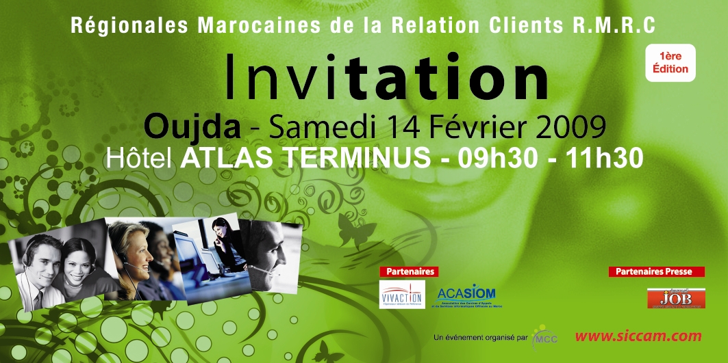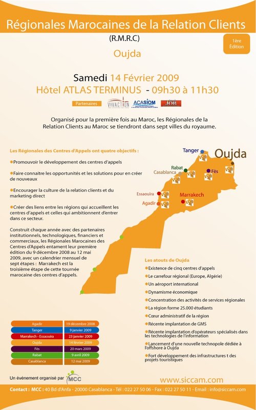Après le succès des trois premières étapes (Agadir, Tanger, Marrakech), retrouvez les Régionales Marocaines des centres d’appels, le 14 Février 2009 à l’hôtel Atlas Terminus, à Oujda.
