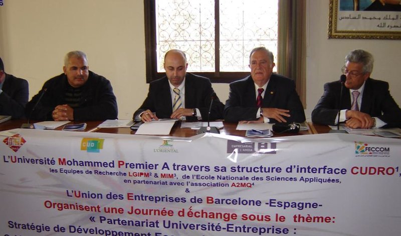 L’université Mohamed I à travers son interface le Centre universitaire pour le développement de l’Oriental,  le laboratoire du génie industriel de maintenance et de production mécanique et les équipes de mathématique, informatique et mécanique   en partenariat avec l’Association marocaine de la maintenance de la qualité,   et l’Union des entreprises de Barcelone a organisé ce weekend  deux journées d’échange sous le thème : Quelle stratégie de développement économique pour la région de l’Oriental dans le cadre d’un partenariat entreprise université. Une première journée pour synchroniser  les efforts entrepris au niveau de la recherche scientifique à des fins de développement socio-économique et une seconde pour effectuer des visites de terrain à des unités industrielles des villes de Nador, Berkane et d’Oujda,