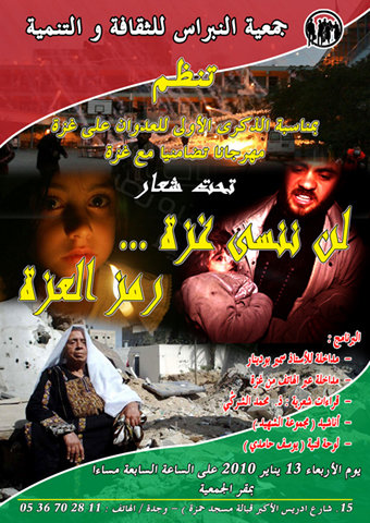 في الذكرى الأولى للحرب الإسرائيلية على قطاع غزة. تنظم لجنة فلسطين بجمعية النبراس للثقافة والتنمية مهرجانا تضامنيا مع غزة تحت شعار » لن ننسى غزة رمز العزة »