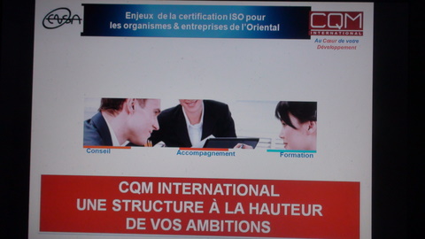 L’Ecole Nationale des Sciences Appliquées Oujda – ENSA O – a organisé le mardi 2010 en collaboration avec CQM INTERNATIONAL une rencontre sous le thème « ENJEUX DE LA CERTIFICATION ISO POUR LES ORGAISMES ET ENTREPRISES ». Cette manifestation a pour but de sensibiliser chercheurs et entreprises à l’intérêt de la certification ISO dans les enjeux de la compétitivité.