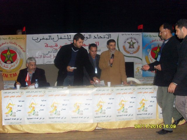 وخلال كلمته الافتتاحية للمؤتمر الجهوي الثاني للاتحاد الوطني للشغل بالمغرب المنعقد بالمركب الثقافي باستور يوم الأحد 28/11/2010، طالب عبد الصمد مريمي حكام الجزائر بالكف عن حبك المؤامرات ضد وحدتنا الترابية كما ندد بالمواقف المتحيزة والعدوانية للحزب الشعبي الاسباني ذي التوجه الاستعماري. و قال نائب الكاتب الوطني إن الطغمة العسكرية في الجزائر التي تتآمر ضد وحدتنا الترابية هي أغرقت البلاد في حمام من الدم في عشرية سوداء يعرفها الوجديون أكثر من كل المغاربة لأن أغلب ضحايا الترحيل التعسفي سنة 1975 كانوا من الجهة الشرقية. وعن دور نقابته في دعم القضية الوطنية، ذكر المتحدث بمواقف الاتحاد في الملتقيات الدولية والإفريقية وتنسيق الجهود مع حلفائه لتفعيل الدبلوماسية النقابية. وفي كلمة الكاتب الوطني التي تلاها المتحدث بمناسبة انعقاد المؤتمر الجهوي، قال إن المؤتمر الوطني الخامس كان نقلة نوعية وعرسا ديمقراطيا باهرا جسد شعار المصداقية الذي رفعه. مشيرا إلى تشويش « بعض الضعفاء الذين سقطوا في الامتحان الديمقراطي وأرادوا قرصنة المؤتمر الوطني ». بعدها، قدم نور الدين محرر تقريرا أدبيا عن أشغال الاتحاد بالجهة الشرقية منذ 2006، حيث وصل عدد المكاتب إلى 46، و 108 ممثلا في اللجان الثنائية ومقعد بمجلس الجهة، رغم المشاكل التنظيمية التي عرفتها المنظمة مؤخرا بعد المؤتمر الوطني الأخير الذي انتخب محمد يتيم بنسبة أزيد من 86 % من مجموع الأصوات. أما بخصوص الإكراهات، فقد حصرها المتحدث في ضعف التواصل مع الأقاليم البعيدة، ضعف التكوين و ضعف الفاعلية لدى الأعضاء.