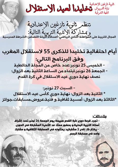 تخليدا لذكرى عيد الاستقلال المجيد،و تفعيلا للمذكرة الوزارية رقم 171 قامت ثانوية تازغين الإعدادية التابعة لنيابة الدريوش بتنظيم أيام ثقافية و فنية و رياضية،و ذلك أيام 25،26 و 27 نونبر 2010،وفق البرنامج التالي: