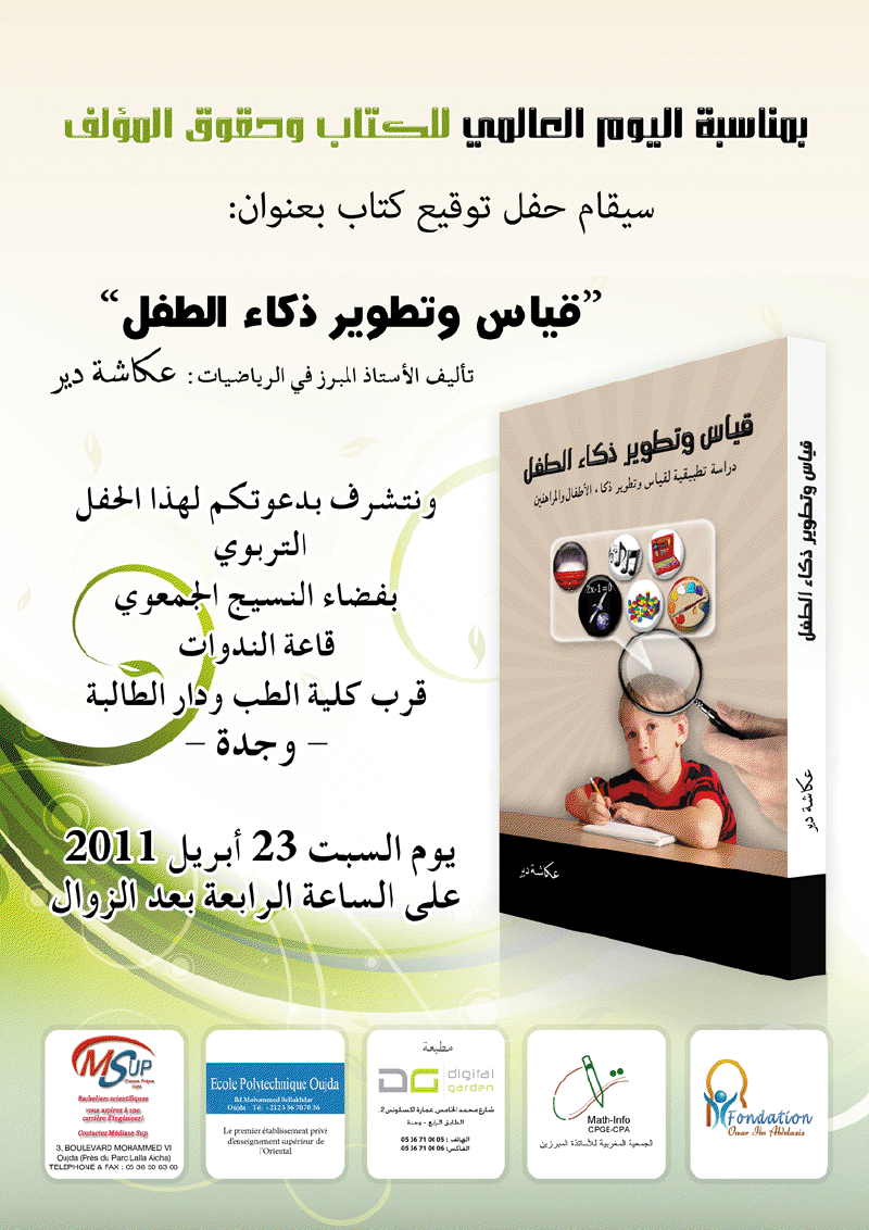 سينظم الاستاذ عكاشة دير ـ استاذ مبرز في الرياضيات ـ حفلا لتوقيع كتابه الجديد المعنون ب : قياس وتطوير ذكاء الطفل » وذلك يوم السبت 23 ابريل 2011 بالفضاء الجمعوي ابتداء من الساعة الثالثة والنصف