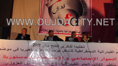 تخليدا لذكرى فاتح ماي 2011 نظمت الفدرالية الديموقراطية للشغل بسينما باريس بوجدة لقاءا جماهيريا تجت شعار ، » الحوار الاجتماعي والاصلاحات الدستورية « ، بتأطير الكاتب العام للفدرالية السيد عبد الله العزوزي ، وذلك يوم 22 ابريل 2011 ، تميز هذا اللقاء بعرض للسيد عبد الهادي خيرات عضو المكتب السياسي لحزب الاتحاد الاشتراكي حول الصلاحات الدستورية ، ونظرا لأهمية هذه الكلمة وبطلب من العديد من زوار وجدة سيتي فاننا نقدم تسجيلا مختصرا لهذا اللقاء الجماهيري ولكلمة السيد عبد الهادي خيرات
