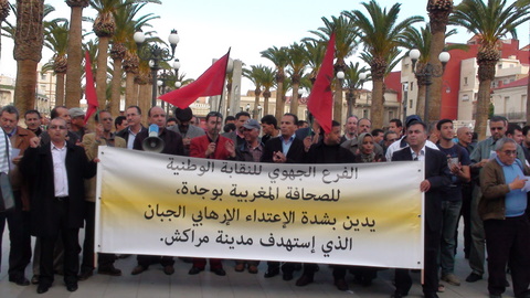 نظم الفرع الجهوي للنقابة الوطنية للصحافة المغربية بوجدة عشية يوم السبت 30 ابريل 2011 وقفة احتجاجية للتنديد وادانة العمل الاجرامي الذي ضرب عمق مدينة مراكش ، والذي يهدف بالاساس الى زعزعة استقرار المغرب ، وعرقلة الاصلاحات الدستورية التي التي اعطى انطلاقتها صاحب الجلالة في خطاب 9 مارس 2011…