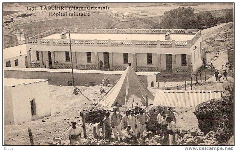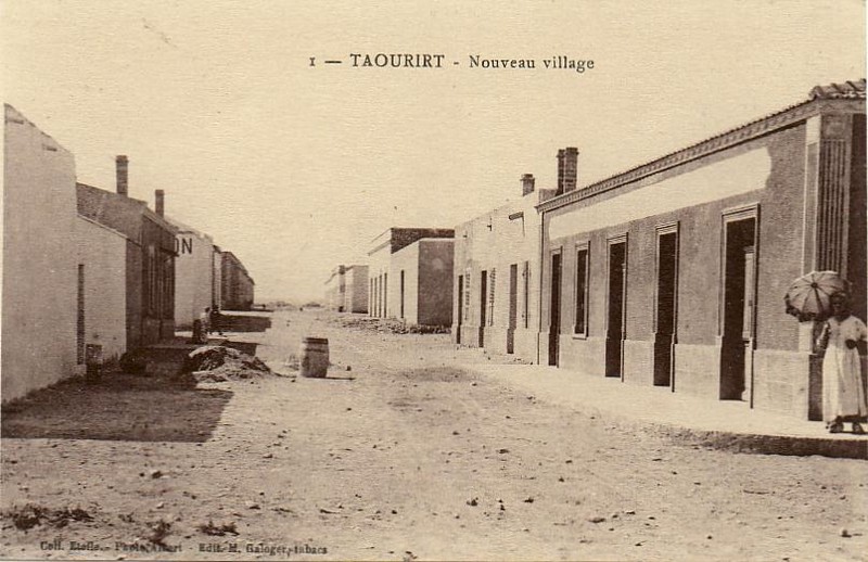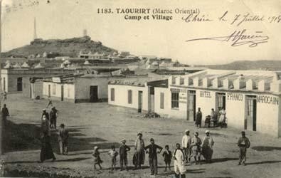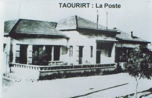 Plus haut la poste avec son ancienne appellation POSTE TELEGRAPHE TELEPHONE(PTT) bien écrite en relief à été agrandi et rénovée pour devenir BARID AL MAGHRIB qui donnait et qui donne toujours sur le boulevard Mohamed V où monsieur MERA faisait le coin de l’autre coté. Il exploitait un grand hangar pour des travaux mécaniques, la vente de pneus et de pièces détachées et une armurerie. Ce fond de commerce a été racheté par le jeune El Jabri qui démarrait déjà dans les bonnes affaires de l’époque, au lendemain de l’indépendance, actuellement il gère à l’échelle nationale de grandes conserveries de poissons. Le premier qui lancé sa fabrique de piments rouges ( TAHMIRA) CONOR à Taourirt à blan lhalfa et faisait sa distribution au Maroc orientale jusqu’à FES,ce qui encourageait les agriculteurs de la région de cultiver ce légume ( NIORA) , seulement toute la population du sud – est de Taourit toussait en respirant l’air infectée par la poussière de cet ingrédient dégagé par l’usine. Ce même endroit a été racheté par FEU Abdallah Boutayeb venu de Debdou pour s’installer à Taourirt, un vétéran de la construction de chaussées goudronnées. Derriere logeaient les deux caids au temps du protectorat : LCAID MIMOUN des citadins et LCAID BENSAID des beni Koulal .LCAID CHAOUI des KRARMA et LCAID HOUMMAD des LARBAE résidaient dans leur banlieue au milieu des leurs sur leurs vastes terres. Ce dernier avait comme instruction d’interdire aux campagnards quelque soit leur origine de s’installer en ville ou plutôt de la vider à 18 h. Allah yarhamhoum.