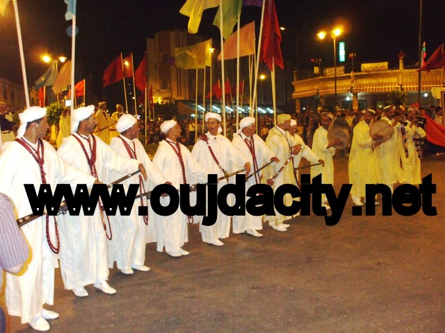 On assistait à la présentation par un certain Cheikh Ahmed qui faisait la HALKA, il était borgne, ses deux GSASBYAS Bendidi et Lamouafak et le rythmeur(L’GUENDOUZ) avec son long tambourin(L’GALLAL) assis à même le sol sur leurs Burnouss, veillait jusqu’à une heure tardive dans la nuit pour animer la soirée au profit des venants des campagnes pour leurs affaires du lendemain ( SOUAKA) à raconter des contes se rapportant à la vie du prophète SIDNA MOHAMED (S L A wa Sallam) et aux conquêtes et guerres saintes qu’il a mené en compagnie de ses fidèles compagnons à la tète des MOUJAHIDINES pour la cause de Dieu et de l’Islam contre les non croyants et les non musulmans ou il ont été souvent victorieux, en les chantant de temps à autre sous forme de poèmes ou de proses. Un conte chanté est appelé LAKSSIDA, il est rythmé et des fois monotone. En tout cas le spectacle est gratuit en plein été et en plein air pour un bon nombre, dont la plupart passera d’ailleurs le reste de la nuit à même le sol sur une vieille natte d’alpha jusqu’au petit matin pour être réveillé par le Muézin à la l’heure de la première prière de la journée LAFJER, couverts par leurs djellabas presque usées et utilisant leurs souliers à semelles pneumatiques ou claquettes d’alpha comme oreillers, sous les réverbères de l’ONE et sur le trottoir gris et glissant du café MON PERE ou les joueurs de la ROUNDA tapent fort sur leurs cartes à même le sol couvert d’une natte en Alfa appelée LAHSSIRA incendiée par ci par là par des mégots jetés et délaissés par des fumeurs distraits en fumant avec extase leur CALUMET de la paix(SABSSI) et en sirotant leur café au Thuin bouilli sur un feu de bois dans une vieille carafe à manche, noircie par la suie, ou leur thé à la mente préparé dans des tellières dont l’eau est bouillie dans un ancien ustensile appelé ZIZOUA abrité par une cheminée sombre dans une fumée de feu de bois produisant une suie noire cumulée pendant plusieurs années. Si la bource déversée à Cheikh Ahmed est importante, on a droit à une FATHA au cours de laquelle il demande à Dieu de bénir tout le monde, même ceux qui n’ont rien donné, de guérir les malades, d’enrichir les pauvres, de donner la pluie, d’éduquer les enfants par les grandes pratiques divines et religieuses , de protéger la nation du prophète contre tout mal éventuel , de sauvegarder l’ISLAM victorieux, de réserver ses morts dans ses hauts paradis et de les garder dans sa miséricorde. La clôture de la soirée est sous forme d’un chant appelé MARJOUAE offert par ce fameux gentil home traduisant une relation d’amour vécue jadis par un guerrier et une princesse ou de poèmes décrivant les détails physiques et l’allure d’une charmante femme que notre Cheikh compose d’une façon instinctive dans une improvisation avec des airs traduisant vraiment ce sentiment et répondant au désir de ceux qui l’écoutent et finit par des bénédictions demandées à Dieu et faites sur le prophète. C’était un grand GOUAL, qualificatif d’une personne qui improvise dans ses chants des paroles et des poèmes exprimant ses sensations vis à vis d’un évènement ou d’une personne qui peut être des fois imaginaire. Allah yarhamhoum.