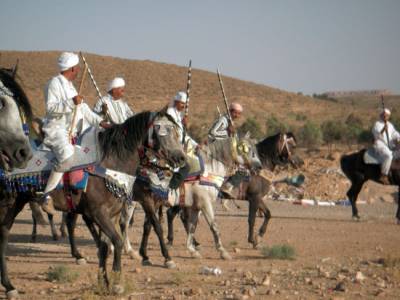 Le clown, le magicien, les jolies dames presque nues pratiquant une gymnastique extraordinaire sur leurs chevaux bien dressés offrant des dances harmonieuses, ainsi que d’autres personnages artistiques encore étaient aussi présents sur scène. Le prix du billet était alors à 1dh 50, rare étaient ceux qui se permettaient ces spectacles. Tous ces loisirs nous procuraient du plaisir et nous réjouissaient. Ce grand terrain était aussi très favorable pour le déroulement des matchs de foot entre les petites équipes des différents quartiers de la ville le jour du vendredi, jour férié pour les écoliers et pendant les courtes vacances. C’était la principale école qui a produit de grands footballeurs POUR L’ASOZT tels que AZIZ le demi centre que j’ai cité plus haut à coté de son frère ainé FENNY devenu tisserand( DERRAZ), JAADAR le terrible avant centre aux jolies talonnades qui avait offert ses service à l’ MCO, moniteur d’éducation physique au lycée de Taourirt, HASSANE l’infirmier qui a évolué à AL HOCEIMA, il est devenu entraineur après ses stages à VICHY, HASSANI sidi Mohamed qui dominait de grands espaces sur le terrain en dehors des bois, le jeune TALLAT gardien du but aussi, les deux frères JARMITE et j’en passe. Tous ces joueurs ont appris seuls sur ce terrain pour devenir des techniciens et des artistes, ils ont tous fait correctement leur vie et suspendu le soulier (AALGO SABBAT) comme ont dit . Principalement cette grande place était réservée à la FANTAZIA.