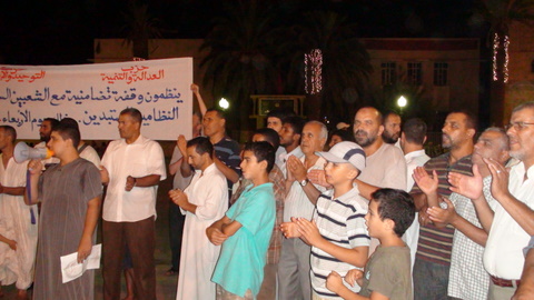 « سوريا ثوري ثوري، على بشار الديكتاتوري »، « ارحل ارحل يا بشار، سوريا أرض الأحرار »، « من المغرب ألف تحية للثورة السورية »، « القذافي امشا وانهار، ليبيا أرض الثوار »…تلكم بعض الشعارات التي رددها مناضلو العدالة والتنمية خلال الوقفة التضامنية مع الشعبين السوري والليبي و التي نفذها حزب المصباح بتنسيق مع حركة التوحيد والإصلاح والاتحاد الوطني للشغل بالمغرب. وخلال هذه المحطة الرمزية التي نظمت يوم الأربعاء 24 غشت 2011 بساحة 9 يوليوز، دعا نور الدين محرر في كلمته إلى استمرار الوقوف بجانب الشعبين الليبي والسوري ومناصرة كل القضايا العادلة للأمة العربية والإسلامية مذكرا بمعاناة الإخوة المجاهدين في فلسطين المحتلة، و منددا بكل أشكال الاستبداد والفساد.