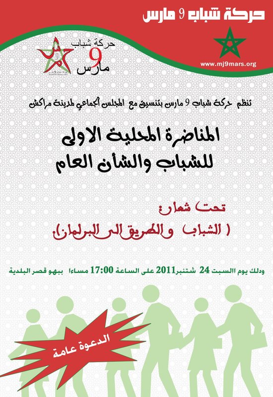 تنظم حركة شباب 09 مارس، المناظرة المحلية الأولى للشباب تحت شعار » الشباب والطريق إلى البرلمان » بتنسيق مع إدارة المجلس الجماعي لمدينة مراكش، وذلك يوم السبت 24 شتنبر 2011 الحالي ببهو قصر البلدية، أمام عرصة مولاي عبد السلام، في مراكش.