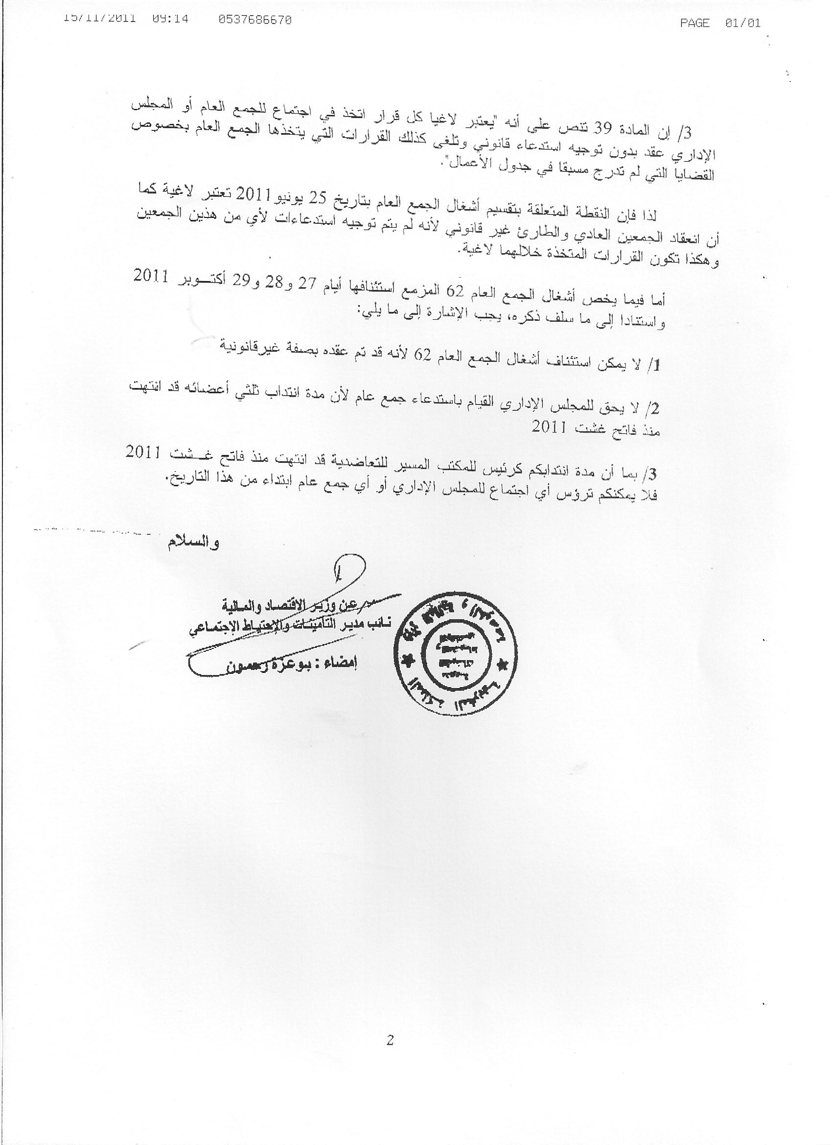 إن المتتبع لما يجري داخل التعاضدية العامة لموظفي الإدارات العمومية، بدأ يلمس بأن المتحكمين بطريقة غير شرعية، في التدبير الإداري و المالي لهذه التعاضدية، قد دخلوا نفقا مسدودا، لا يمكن الخروج منه إلا بتطبيق الفصل 26 من ظهير 1963 المنظم للتعاضد.و قد سبقت الإشارة الى أن عبد المولى عبد المومني، فقد ابتداء من فاتح غشت 2011 ، صفة رئيس المجلس الإداري للتعاضدية، بناء على مقتضيات الفصل 32 من القانون الأساسي للتعاضدية. و معلوم أنه بمقتضى هذا الفصل، حددت مدة ولاية رئيس المجلس الإداري و من معه من أعضاء المكتب الإداري، في سنتين. و للتذكير، فان هذا المكتب تم انتخابه يوم 1 غشت 2009 . و بناء عليه لم يعد لعبد المولى عبد المومني، مسموحا له ترأس اجتماعات المجلس الإداري، و لا أي جمع عام من أي نوع كان. إلا أنه بدل احترام القانون، أصر عبد المولى عبد المومني، على تنظيم جمع عام ، خارج كل الضوابط القانونية، نهاية شهر أكتوبر الماضي بمراكش. و هو الجمع العام الذي تحالف فيه مع أتباع الفراع و مجموعة من الانتهازيين، بطريقة غير أخلاقية و غير قانونية، من أجل إبعاد مناضلي الاتحاد المغربي للشغل، من عضوية المجلس الإداري. و بخصوص الوضع الغير قانوني للأجهزة المسيرة للتعاضدية، وجه وزير المالية، بحكم أنه يمثل سلطة وصاية على قطاع التعاضد، رسالة الى عبد المولى عبد المومني، يذكره فيها، بأنه انتهت مدة صلاحيته كرئيس للمجلس الإداري، و لم يعد مسموحا له استعمال هذه الصفة. و قد اعتبرت هذه الوزارة، بناء على أحكام ظهير 1963 المنظم للتعاضد و كذا القانون الأساسي للتعاضدية، بأن كل القرارات الصادرة عن الجمع العام الغير قانوني الذي نظم بمراكش بتاريخ 25 يونيو الأخير و كذا الجمع العام الغير قانوني الذي نظم بمراكش نهاية شهر أكتوبر الماضي، لاغية بقوة القانون. و عليه فان التعاضدية العامة، أصبحت تعيش مرحلة فراغ قانوني خطير، لا يمكن الخروج من متاهته، إلا بتطبيق الفصل 26 من ظهير 1963 المنظم للتعاضد. و السؤال المطروح: هل سيظل أغماني، وزير التشغيل الاتحادي، ملتزما الصمت إزاء ما يقع من تطورات خطيرة داخل التعاضدية، و هو الصمت الذي يمكن اعتباره تواطؤا مع عبد المولى عبد المومني الاتحادي؟؟؟؟ إن هذه الحسابات السياسية الضيقة، أصبحت ترهن بشكل سلبي مصير التعاضدية. و هو وضع غير مقبول.