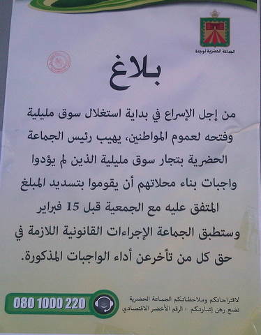 هذا وبهذه المناسبة أصدرت الجماعة الحضرية البلاغ التالي الموجه للتجار الذين ما زالوا لم يسددوا مستحقات بناء دكاكينهم ، لأن كل تأخر في اداء المستحقات سيعرقل سرعة البناء ، ولهذا عليهم ان يسارعوا بتسديد واجبات البناء في اقرب وقت ممكن ، وذلك قبل تاريخ 15 فبراير ، واذا لم يفعلوا ذلك فان الجماعة ستتخذ اجراءات قانونية في حقهم قد تصل الى سحب القرار منهم وتسليمه لمن يسدد مستحقات البناء ..