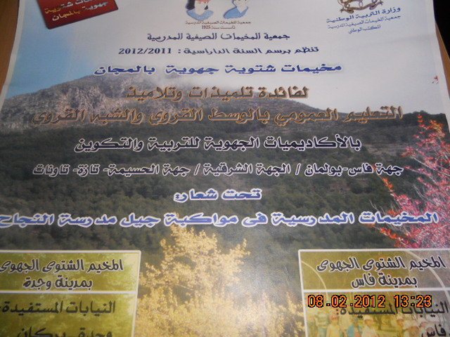 تحت شعار(المخيمات المدرسية في مواكبة جيل مدرسة النجاح) ، نظمت جمعية المخيمات الصيفية المدرسية مخيمات شتوية جهوية بالمجان لفائدة تلامذة الوسطين القروي وشبه القروي ، في الفترة الممتدة من 02 الى 09 فبراير2012.