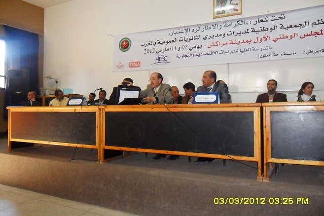 تنظم الجمعية الوطنية لمديرات ومديري الثانويات العمومية بالمغرب يومي 03و04مارس2012 بالمدرسة العليا للدراسات الاقتصادية والتجارية بمراكش المجلس الوطني الأول تحت شعار « الكرامة والإطار لرد الاعتبار ».