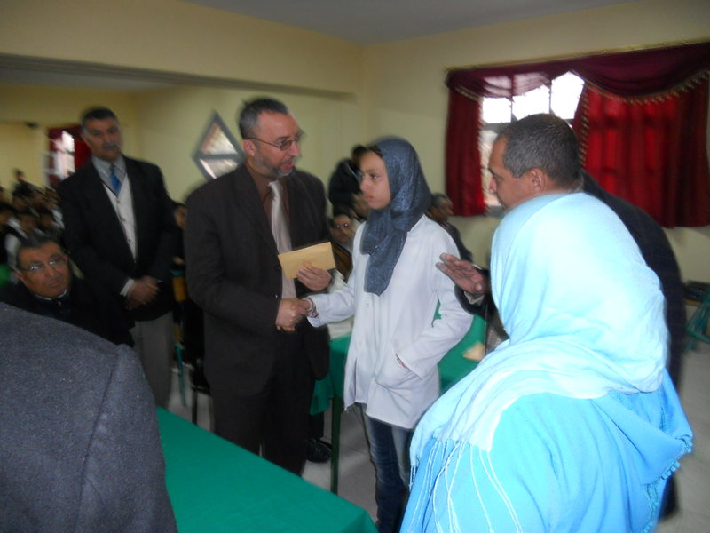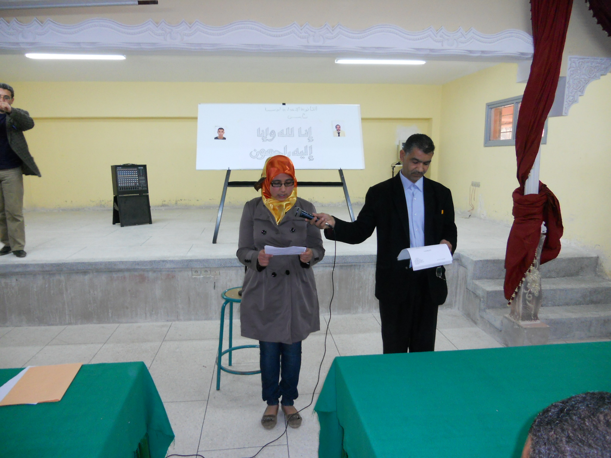 كما تم توزيع مساهمة مادية على أسرتي الفقيد والتلميذتين باسم أطر الإدارة وهيأة التدريس وجمعية آباء وأمهات وأولياء تلاميذ المؤسسة .