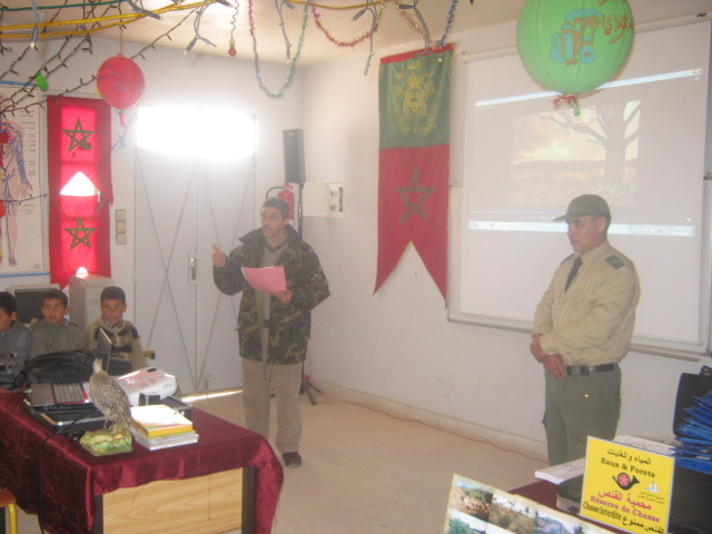 بقاعة الاعلاميات حيت أخذ التلاميذ أماكنهم، ألقى السيد رئيس المؤسسة كلمة رحب فيها بالحاضرين وتمنى لهم قضاء وقتا مفيدا وممتعا مع المؤطرين .إثر ذلك تقدّم السيد المرابط وعرّف بنفسه وبزميله والهدف من زيارتهما للمؤسسة.ثم بدأ النشاط بعرض شريط من انجاز مصلحة المياه والغابات تطرق لجوانب كثيرة منها الثروة الطبيعية من نباتات وحيوانات والكيفية السليمة للاستفادة منها دون إلحاق الضرر بها وذلك من خلال القنص والصيد والرعي والنزهة والرحلات والرعي المنظم.وفي هذا الإطار، أعطى الشريط نظرة شاملة على أصناف الطرائد وعددها وفترات وأماكن القنص المسموح بها.وتضمن الشريط أيضا بعض السلوكات التي تضر بالغابة من خلال تصرفات بعض القناصين الذين لا يحترمون القوانين الجاري بها العمل ويتصرفون بوحشية رغم أن ديننا الحنيف يحثّ على الرحمة والرأفة بالكائنات الحية ومنها الحيوانات على الخصوص.فور انتهاء الشريط ، بدأت المناقشة حيت عبّر التلاميذ من خلالها عن ما فهموه من العرض ، كما طرح بعضهم أسئلة تهم الموضوع وأجاب عليها المنشطان بصدر رحب.تلا المناقشة شريط كارتوني مرح عبارة عن قصة مصورة لأفراد عائلة وكيفية التعامل مع البيئة من خلال حياتهم اليومية، فاكتشف التلاميذ بعض التصرفات العادية ولكن تضر بالطبيعة من رمي الأزبال وقطف البراعم الصغيرة للنباتات وتخريب بيض وأعشاش بعض الطيور.