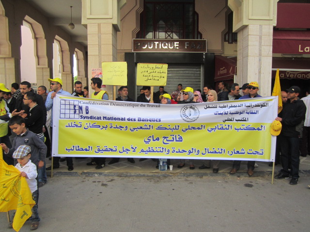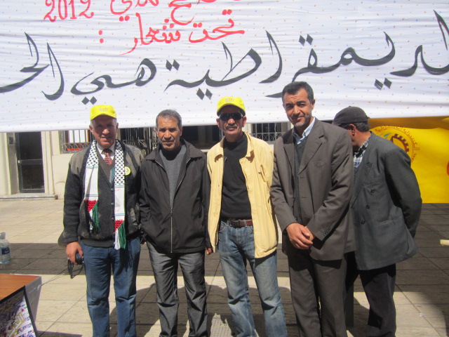 في البداية نتوجه كمكتب إقليمي ل ن و ت /ك د ش بوجدة وباسم الاتحاد المحلي ل ك د ش بتحية نضالية عالية إلى كافة المناضلات والمناضلين الكونفدراليين الشرفاء بمناسبة تخليد الذكرى العمالية الأممية .ونعتز بالحضور النوعي والمتميز والمنسجم مع المبادئ الصحيحة التي لا تهزها الرياح مهما عتيت بل تشدها القيم الإنسانية والوطنية السامية والارتباط بقضايا العمال وانشغالات المجتمع بعيدا عن الذاتية والانتهازية والبحث عن المواقع. وحضور الشغيلة التعليمية ممثلة بكل الفئات هو تأكيد على ما أعلناه في العديد من المحطات آخرها تجديد المكتب الإقليمي بوجدة على أن جسم النقابة الوطنية للتعليم سليم معافى حاملا لمشعل الحرية والكرامة ومحاربة الفساد وصون كرامة نساء ورجال التعليم الذين يستحقون كل التقدير والاحترام وبمناسبة فاتح مايو 2012 :