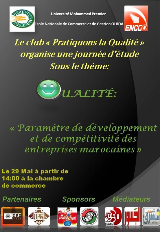 du pays en matière de qualité, le club « pratiquons la qualité », un club composé de 9 étudiants ENCGISTE munie d’une volonté a promouvoir et aider au développement du tissus économique du pays, Organise une journée d’étude le 29 mai sous le thème : « la qualité: Paramètre de développement et de compétitivité des entreprises marocains » a la chambre de commerce d’Industrie et de Services -Oujda-