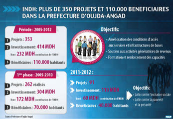 Quelque 353 projets ont été réalisés ou sont programmés au niveau de la préfecture d’Oujda-Angad durant la période 2005-2012, dans le cadre de l’Initiative Nationale pour le Développement Humain (INDH).