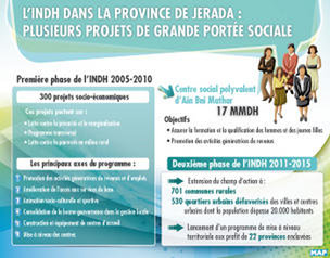 Durant la première phase de l’INDH (2005-2010), la province de Jerada a bénéficié de plus de 300 projets à caractère socio-économique, portant sur la lutte contre la précarité et la marginalisation, le programme transversal et le programme de lutte contre la pauvreté en milieu rural.
