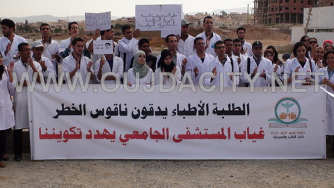 نظم طلبة كلية الطب والصيدلة بوجدة يوم الاربعاء 26 شتمبر الحالي وقفة احتجاجية بورش البناء للمستشفى الجامعي ، محتجين على التأخر الحاصل في عملية الانجاز ، خصوصا وان الطلبة مقبلين خلال السنة القادمة على المرحلة ـ الداخلية ـ التطبيقية ، وفي حالة ما اذا لم يكن المستشفى الجامعي جاهزا خلال السنة الجامعية 2013 / 2014 فسيكون الأمر كارثي بالنسبة للأطباء الداخليين …. كما تضمنت مطالب الطلبة ايضا التغطية الصحية ، والرفع من منحة الدراسة …والرتقاء بشهادة الدكتراه في الطب الى مستوى دكتراه الدولة كما هو عليخ الشأن في العديد من الميادين العلمية والمعرفية الأحرى ـ انظر البيان رفقته ـ