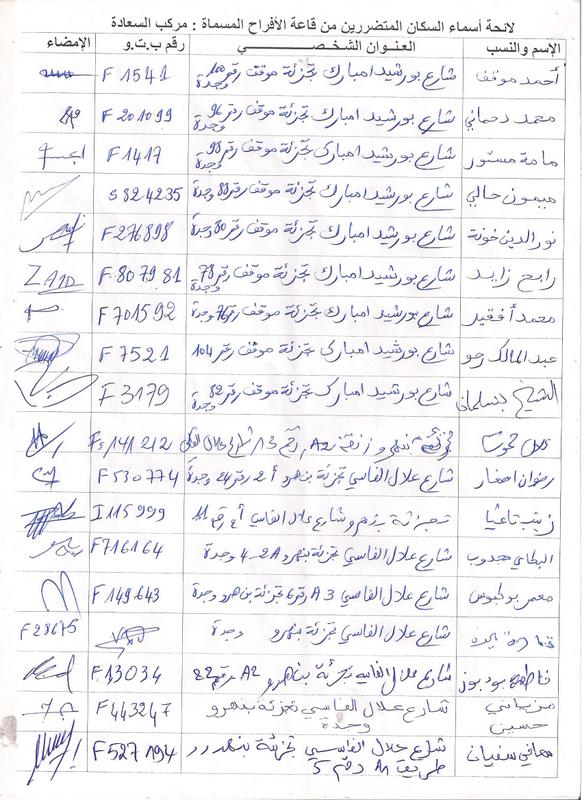 سيدي الوالي المحترم : راسلنكم عدة مرات بخصوص قاعة الأفراح المسماة مركب السعادة والكائنة بشارع بورشيد أمبارك تجزئة موقف ، كما التمسنا من سعادتكم عدة مرات مقابلتكم لنوضح لسعادتكم عن قرب معاناتنا المريرة من هذه القاعة وكيف حصل مالكها على رخصة الإستغلال رغم تعرضنا ، ورغم أن هذه القاعة من المفروض أن تكون قاعة للحلاقة والتجميل ، لكن لازلنا ننتظر ، اليوم سيدي الوالي المحترم صاحب هذه القاعة يقوم ببعض الإصلاحات للحمام الكائن تحت هذه القاعة ، لكن هدفه تغيير باب قاعة الأفراح إلى الوجهة الثانية من البناية هذه الوجهة التي ستكون مقابلة للملحقة الإدارية الثامنة عشر التي هي في طور البناء مع مسجد الرياض وستكون الطامة أكبر والضرر أكثر .