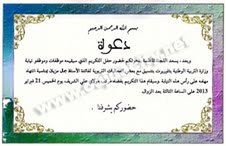 وبعد ، يسعد اللجنة المنظمة  بدعوتكم  لحضور حفل التكريم الذي سيقيمه موظفات وموظفو نيابة وزارة التربية الوطنية  بتاوريرت  بتنسيق مع بعض الفعاليات  التربوية لفائدة الاستاذ جمال مزيان بمناسبة انتهاء مهامه على راس هذه النيابة  ، وسيقام هذا التكريم بفضاء مركب مولاي علي الشريف يوم الخميس 21 فبراير 2013 على الساعة الثالثة بعد الزوال