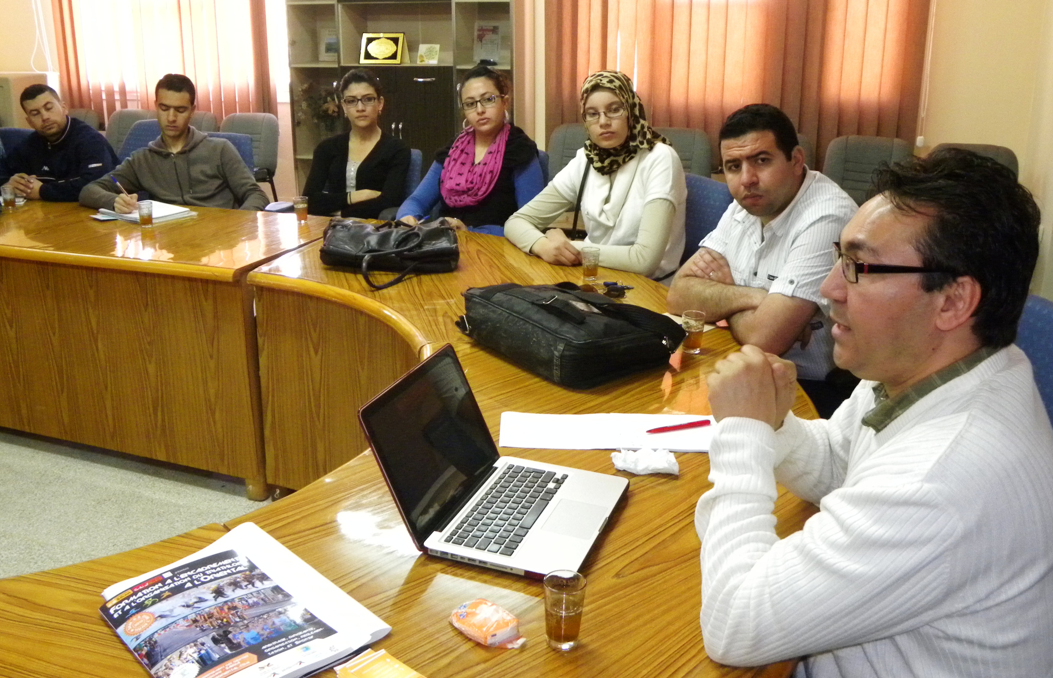 Dans la continuité de la première formation des étudiants du master “TOURISME et PATRIMOINE” de la Faculté des Lettres et des Sciences Humaines d’Oujda, et dans le cadre des activités de l’Axe Gouvernance de la CUI-CUD/UMP06 (sous-axe: Aff. Estudiantines), M. Mohammed MARRAKCHI, porteur des deux projets à Saidia: “Aquathlon & Traithlon”, président de l’association Vandopérienne de Nancy CESAM, a rencontré vendredi 29 mars 2013 de 10 h à 12h les étudiants du Master “Tourisme et Patrimoine” de la Fac des Lettres d’Oujda pour discuter sur ses futurs projets sportifs 2013/2014, en relation avec le développement touristique des territoires, “Triathlon, Aquathlon, Duathlon, rassemblement international de basket, et autres…).