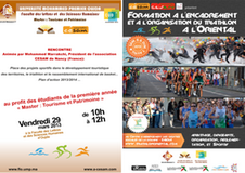 Pour rappel, L’association CESAM, la Ligue Lorraine de Triathlon en collaboration avec l’Association des parents d’élèves de SAIDIA et la Faculté des Lettres d’Oujda “Master Tourisme et Patrimoine” et autres organismes nationaux et internationaux, mettront une formation sur l’organisation et la présentation du Triathlon et ses disciplines associées le 06 et 07 Avril 2013 à SAIDIA , avec l’animation de :