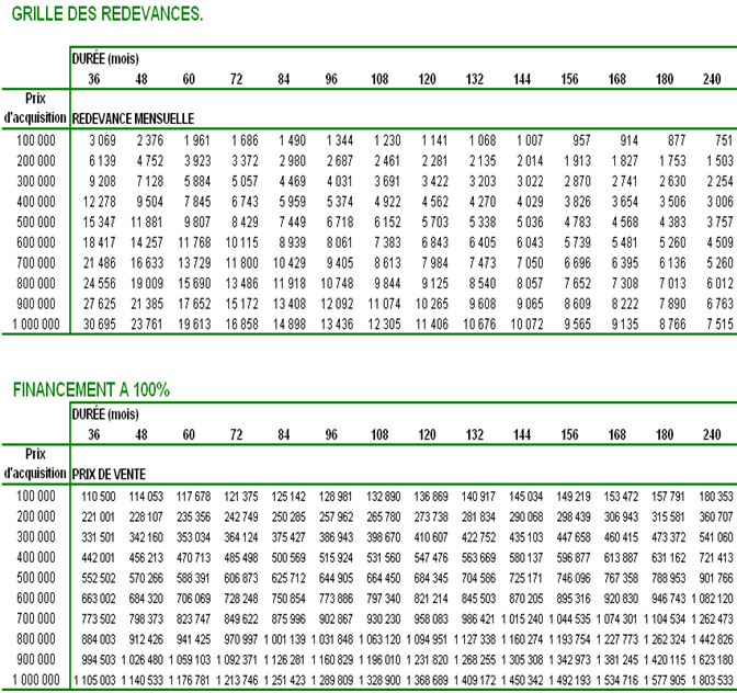– Le montant du financement pour une durée de remboursement déterminée sera calculé en fonction de la mensualité devant rester nécessairement inférieure ou égal à 50% du salaire mensuel net en tenant compte des prélèvements sur salaire.