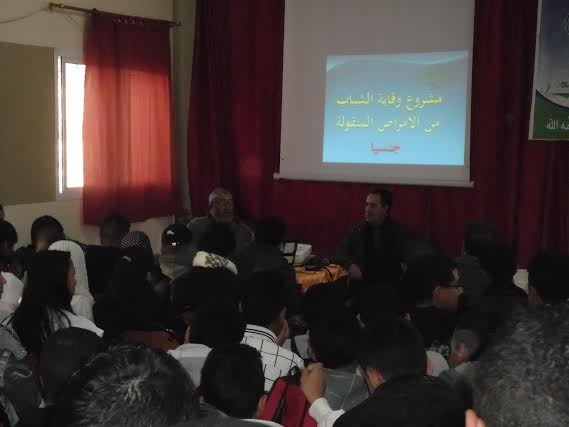 في ايطار الانشطة التربوية التي تنظمها جمعية آباء وأولياء التلاميذ بثانوية وادي الذهب التأهيلية بتنسيق مع ادارة المؤسسة ، قامت هذه الاخيرة باستضافة ذ. محمد بنفور عضو فريق وقاية الشباب من الامراض المنقولة جنسيا تحت اشراف الاتحاد العالمي للجمعيات الطبية الاسلامية يوم الاربعاء 11-12-2013 وذلك بمناسبة اليوم العالمي للسيدا.وبعد الكلمة الافتتاحية للسيد رئيس جمعية الاباء وأولياء التلاميذ الذي رحب فيها بالتلاميذ و بالأستاذ ، أكد على أهمية مثل هذه الانشطة التربوية التي تساهم بشكل فعال في تنمية المعلومة عند التلميذ وكذا معالجة العديد من الظواهر السلبية التي تعرفها الكثير من المؤسسات التعليمية كما أكد على أهمية الاكثار من مثل هذه الانشطة للحد من الملل الذي قد يشعر به التلميذ .