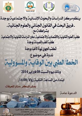 اعلان عن ندوة علمية حول موضوع : ألخطأ الطبي بين الوقاية والمسؤولية