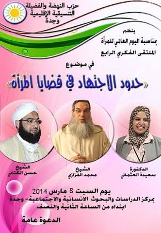 ويبدو أن زيارة شيوخ السلفية المعتقلين السابقين حسن الكتاني الفزازي محمد لتأطير ندوة رفقة الأستاذة سعيدة العثماني حول: « حدود الاجتهاد في قضايا المرأة » بسبب النقاش الدائر حول منع التعدد، وإعادة الاجتهاد في الإرث، وزواج القاصر التي تناولها النص الشرعي، قد أرق الكثيرين، وقض مضجعهم، خوفا من انتصار الشريعة في موضوع المراة، وتهاوي الأطروحات التمييعية والتغريبية، خصوصا وأن الندوة يؤطرها أساتذة أكفاء، وشيوخ أجلاء، قادرون بعون الله، على رفع اللبس الحاصل في هذا الموضوع، وتفنيد ما علق به من شبهات.
