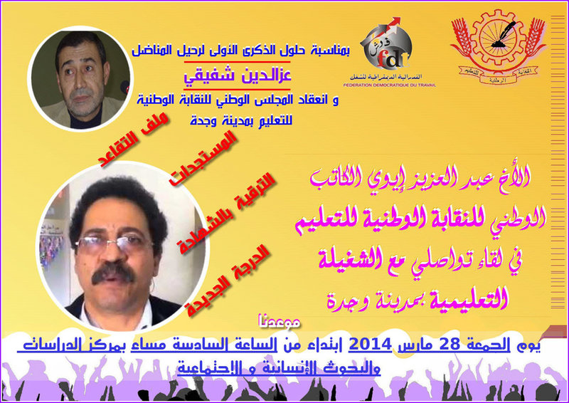 على هامش انعقاد المجلس الوطنـي للــنقـابة الوطنية للتعليم (ف د ش ) بـمـدينة وجـدة، يتـــشرف المكتب الجهوي بدعوة أخوتـكم لحضور اللــقـاء التواصلي مع الشـغـيلـــة التعليمية و الــــذي سيؤطـره الأخ الكاتب الوطني حول مسـتجدات الساحـة التعليمــية ،وأفـاق الحوار القطاعي على ضوء الملف المطلـبي: إحداث درجة جديدة، إشكالية إصلاح أنظمة التقاعد، التعويض عن المناطق النائية، ملف الإجازة والماستر، مشروع النظام الأساسي الجديد …