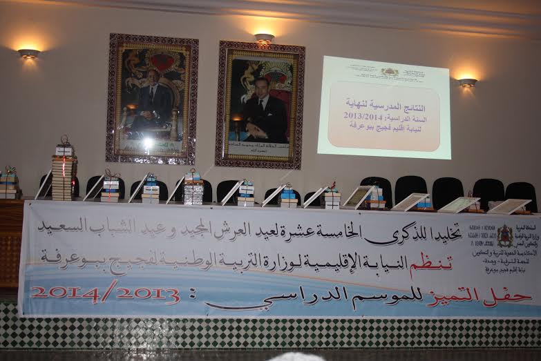 احتفاء بالذكرى الخامسة عشرة لعيد العرش المجيد وبذكرى عيد الشباب، نظمت النيابة الاقليمية لفجيج ببوعرفة التابعة للأكاديمية الجهوية للتربية والتكوين للجهة الشرقية تحت الرئاسة الفعلية لعامل صاحب الجلالة على اقليم فجيج يوم 8 يوليوز 2014 حفل التميز للاحتفاء بالتلميذات والتلاميذ المتفوقون خلال الموسم الدراسي 2013/2014.