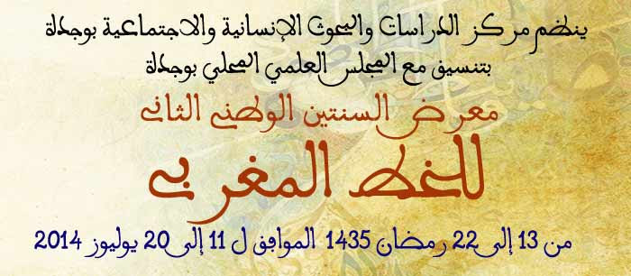 بتنسيق مع المجلس العلمي المحلي بوجدة نظم مركز الدراسات والبحوث الانسانية و الاجتماعية معرض السنتين الوطني الثاني للخط المغربي والذي يمتد من 13 الى 22 رمضان 1435 الموافق ل 11 الى 22 يوليوز 2014