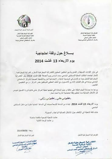Home»National»المستشفى الجامعي بوجدة : بـــــلاغ حول وقفة احتجاجية يوم الاربعاء 13 غشت 2014
