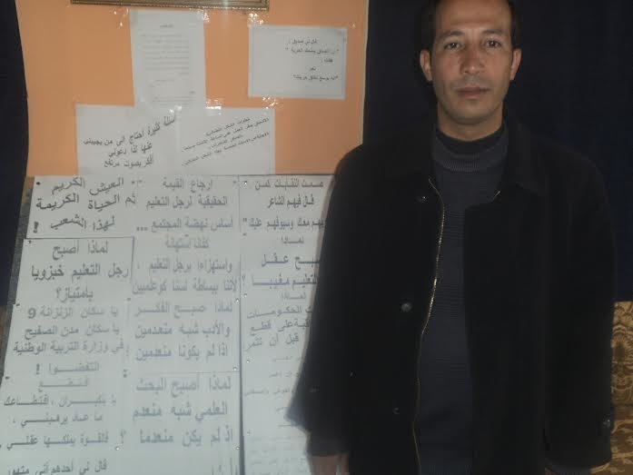 الساعة تشير إلى العاشرة صباحا ، بدأت بإلصاق الشعارات حتى تظهر للعيان ، وبعدها إسترسلت في إلقاء الشعارات أو بالأحرى الشعار الوحيد » مسكين الكوعليم كلاولو حقو في التعليم كلاولو حقو في التفكير كلاولو حقو في التغيير » إلى أن عرفني رجل أنيق ببذلة رسمية ( كوستيم ) ونظارات ، على أنه القائد ببوعرفة . فطلب مني أن أشرح له عن ماذا أفعل ؟ فقلت إنني أحتج.فطلب مني الإنسحاب، فجاوبت على أن ما افعله قانوني. فأخذ ينزع الملصقات والتي على رأسها إرجاع القيمة الحقيقية لرجل التعليم ، أساس نهضة المجتمع . فرأيت أمام أعيني هذا الشعار ملقا على الأرض، أو بمعنى أصح حلمي ملقى على الأرض .، وبعدها بدأ يرفس شعاراتي إلى أن طلبت منه الكف عن ذلك وقال لي أن سلوكي ليس سلوك رجل تعليم فجاوبته هل سلوكك سلوك رجل سلطة ؟ فاقترب إلى أذني وهمس لي بكلمات نابية ، فكررتها عنه بصوت مرتفع قائلا : هذا ما قاله لي رجل سلطة . وأدركت حينها أن لسانه ليس مؤنقا و أنقى من أسفل حذائه . وبعد فشله في جعلي أنسحب ، جاء بعده السيد الباشا ، ولم يلزمني بالانسحاب . وبعدها جاءت سيارات أخرى برجال الأمن ، وكنت ألقي كلمات شعرية فقالوا إنك رددت شعاراتك ، وأكملت قصيدتك لدى عليك بالإنسحاب . فقلت أنني لم أنتهي بعد من ثلاث ساعات الوقفة الاحتجاجية، فقالوا أن ما أفعله غير قانوني ، فقلت اعتقلوني إذن . فقالوا : لا لن نفعل ذلك ولكن إنسحب واتركنا نزاول مهامنا الأخرى .