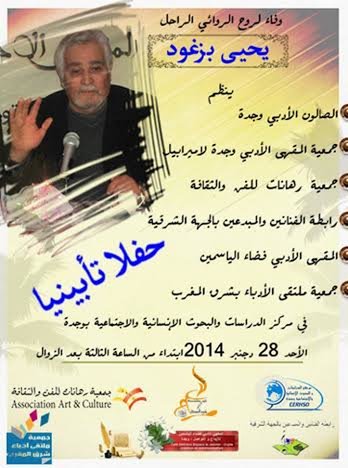 وفاء لروح الراحل يحيى بزغود ينظم الصالون الأدبي وجدة وجمعية المقهى الأدبي لاميرابيل وجدة وجمعية رهانات للفن والثقافة ورابطة المبدعين بالجهة الشرقية والمقهى الأدبي فضاء الياسمين وجمعية ملتقى الأدباء بشرق المغرب، حفلا تأبينيا بمركز الدراسات يوم الأحد 28 دجنبر 2014 ابتداء من الساعة الثالثة بعد الزوال