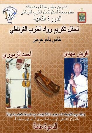 انطلاقا من مبدإ التقدير والاعتراف، وانسجاما وروح الوفاء والعطاء ومواصلة مشوار التكريم والاحتفاء، نظمت « جمعية السلام لقدماء الطرب الغرناطي » ليلة نهاية السنة الميلادية 2014 بالمركب الثقافي البلدي بوجدة، الدورة الثانية « لحفل التكريم » الذي تخصصه الجمعية لرواد الطرب الغرناطي المجدين بمدينة وجدة، والذين أسهموا في المحافظة واستمرار هذا الفن العريق في الزمان والمكان، وهي النسخة التي أفردتها الجهة المنظمة لرائدين اثنين شكلا معا ظاهرة فنية في فن الطرب الغرناطي وهما: الشيخ أحمد الزموري والصنايعي اقويدر مهدي رحمهما الله…