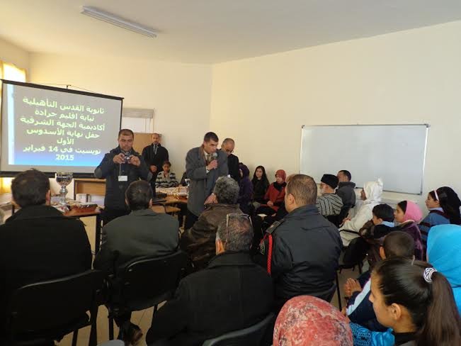 عاشت ثانوية القدس التأهيلية بتويسيت صبيحة يوم السبت 14 فبراير 2015 نشاطا تربويا هاما تمثل في تكريم تلميذات وتلاميذ المؤسسة المتفوقين خلال الدورة الأولى من الموسم الدراسي الحالي، وقد حضر الحفل السيد النائب الإقليمي لوزارة التربية الوطنية بجرادة الدكتور محمد زروقي بمعية رؤساء المصالح بالنيابة وممثلي المصالح الأمنية بالمدينة والسيد رئيس المجلس البلدي لجماعة تويسيت والسيد رئيس المجلس القروي لبلدية سيدي بوبكر والسيد ممثل جمعية أمهات وآباء وأولياء التلاميذ والسادة رؤساء المؤسسات التعليمية ورؤساء جمعيات المجتمع المدني ومجموعة من أطر المؤسسة التربوية والإدارية وكافة التلاميذ المتفوقين.