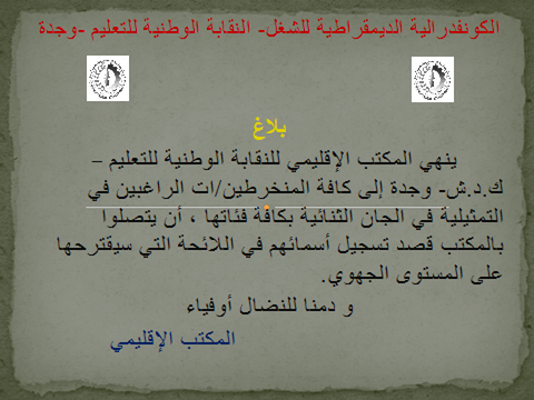 ينهي المكتب الإقليمي للنقابة الوطنية للتعليم – ك.د.ش- وجدة إلى كافة المنخرطين/ات الراغبين في التمثيلية في الجان الثنائية بكافة فئاتها ، أن يتصلوا بالمكتب قصد تسجيل أسمائهم في اللائحة التي سيقترحها على المستوى الجهوي.