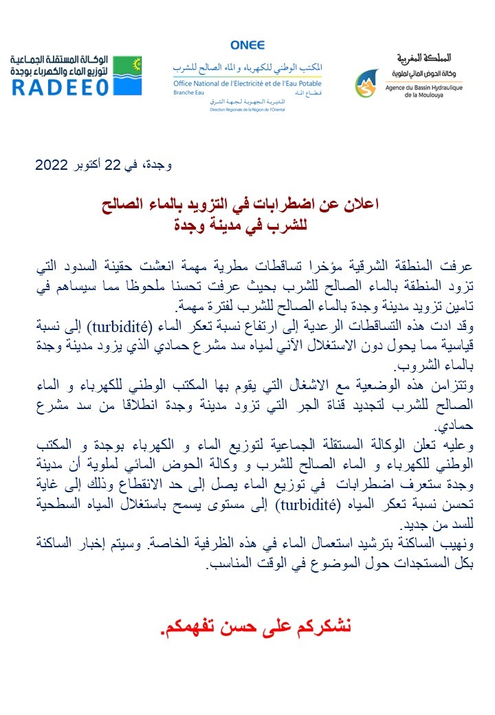 ارتفاع نسبة تعكر مياه سد مشرع حمادي …يترتب عنه اضطراب في تزود مدينة وجدة بالماء الصالح للشرب : بلاغ